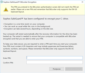 I have installed all three packages; Prerequisite, Client setup and Client config. I have successfully contacted the SafeGuard server, synced and registered the user. When the laptop gets rebooted for a final time, just before encryption kicks off, I receive a Windows error message stating that "Bitlocker could not be enabled" followed soon by a Sophos error message stating that the pin I entered before reboot was not the same as the pin I entered at boot. I have attached both screenshots to this thread.