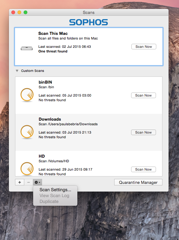 I ask this, because I'm still curious to see the full scan log for the scan that detects the threat you're having trouble with. Also I have to apologize I wasn't clear on how to get the scan logs. You should use the "gear" icon if you want to grab the scan logs for one of the custom scans. If you want to get the log for the "Scan this Mac" main scan, you can just alt-click the white space on the "Scan this Mac" menu and select "View Scan Log"