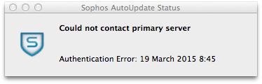 This morning, the Sophos icon displayed an X in the center of the shield but wasn't grayed out, and the first entry on the menu was a grayed out "Failed To Download Update".  Choosing "Update Now" causes the Sophos AutoUpdate Status window to open, briefly display the "downloading" bar, then end with "Could not contact primary server" and "Authentication Error" followed by the date and time.  Looking into the console, I see that early this morning there were a number of messages regarding Sophos, almost all of them along the following lines: "3/19/15 7:28:22.685 AM SophosSXLD[137]: [SMESXLInterface.m:437] no DNS addresses found", and similar messages appear to go back to at least March 13.