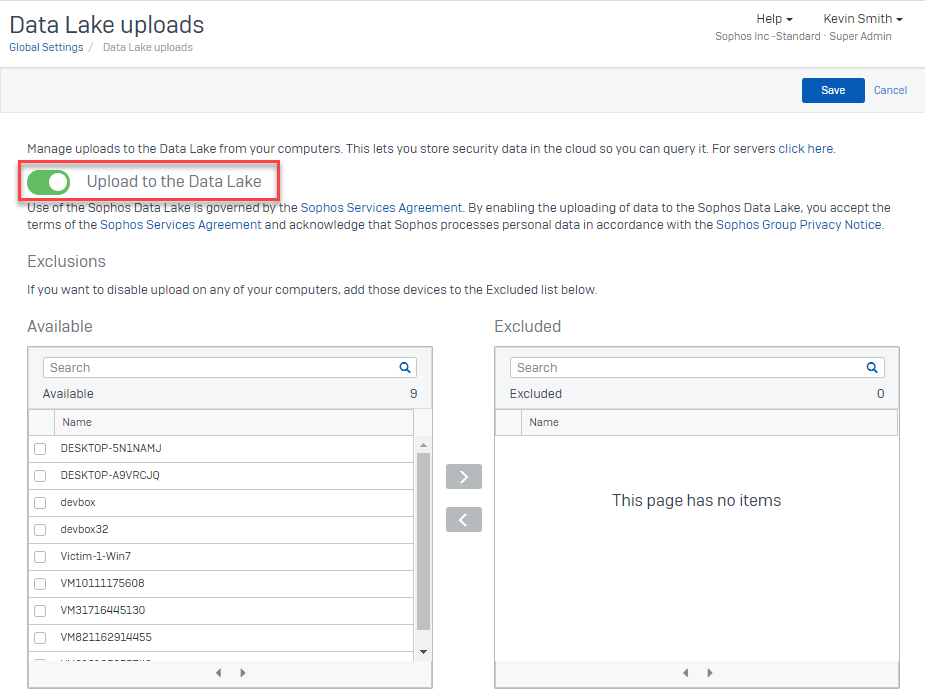 In your Sophos Central console select ‘Global Settings’ then under Endpoint select the ‘Data Lake uploads’ setting and turn on the 'Upload to the Data Lake' toggle. Once enabled we will perform scheduled hydration queries on for your devices which capture interesting threat hunting related data and send it to the Data Lake. From the settings page you can also exclude specific devices from sending data to the Sophos Data Lake if you wish.