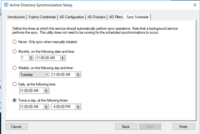 | Active Directory synchronization failed. Reason: SophosCloudADSyncLib.DisplayableException: Error making a request over LDAP. Please review the connection settings you specified. The LDAP server returned the following error: The operation was aborted because the client side timeout limit was exceeded. ---> System.DirectoryServices.Protocols.LdapException: The operation was aborted because the client side timeout limit was exceeded. at System.DirectoryServices.Protocols.LdapConnection.ConstructResponse(Int32 messageId, LdapOperation operation, ResultAll resultType, TimeSpan requestTimeOut, Boolean exceptionOnTimeOut) at System.DirectoryServices.Protocols.LdapConnection.SendRequest(DirectoryRequest request, TimeSpan requestTimeout) at SophosCloudADSyncLib.LdapRequestCommand.SyncExeImpl(Object runtimeArg) --- End of inner exception stack trace --- at SophosCloudADSyncLib.LdapRequestCommand.SyncExeImpl(Object runtimeArg) at CommandLib.Command.BaseSyncExecute(Object runtimeArg, Command owner) at SophosCloudADSyncLib.LdapSearchCommand.searchLdap(SearchParams searchParams) at CommandLib.Command.BaseSyncExecute(Object runtimeArg, Command owner) at SophosADSync.GetAllADEntriesCommand.GetGroups(SearchBase searchBase, HashSet`1 groups) at SophosADSync.GetAllADEntriesCommand.GetObjectsInTree[T](LDAPFilters ldapFilter, SearchBase searchBase, HashSet`1 objects, GetObjects`1 getObjectsDelegate) at SophosADSync.GetAllADEntriesCommand.GetObjectsInForest[T](LDAPFilters ldapFilter, HashSet`1 objects, GetObjects`1 getObjectsDelegate) at SophosADSync.GetAllADEntriesCommand.GetObjectsInForest[T](LDAPFilters ldapFilter, GetObjects`1 getObjectsDelegate) at SophosADSync.GetAllADEntriesCommand.SyncExeImpl(Object runtimeArg) at CommandLib.Command.BaseSyncExecute(Object runtimeArg, Command owner) at SophosADSync.GetChangesCmd.SyncExeImpl(Object runtimeArg) at CommandLib.Command.BaseSyncExecute(Object runtimeArg, Command owner) at SophosADSync.ADSyncCommand.SyncExeImpl(Object runtimeArg) at CommandLib.Command.BaseSyncExecute(Object runtimeArg, Command owner) at SophosADSync.ChangeStateAndADSyncCommand.SyncExeImpl(Object runtimeArg) |