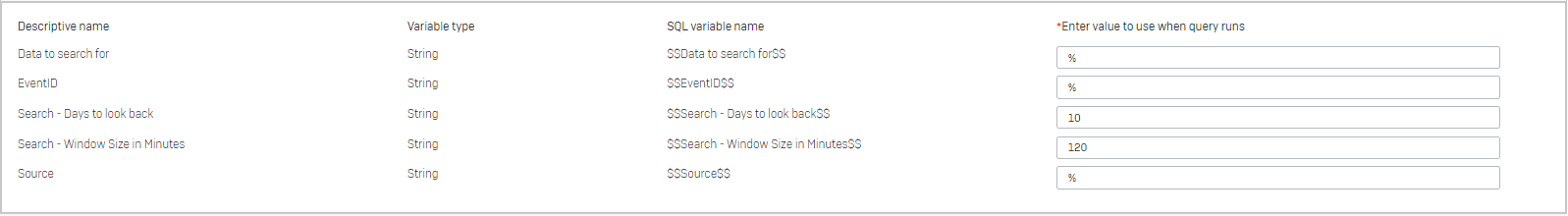 | event logs. we have to specify source as % (wildcard) so that we search all of them. If we |