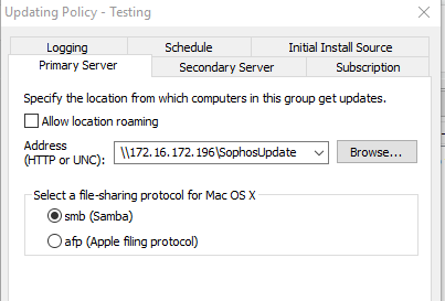 1. Create a new test updating policy and change the initial install path to be \\ip\sophosupdate.