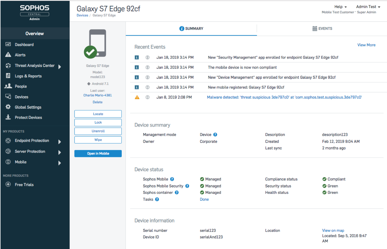 The last new UI feature is the device page in the Central Overview (when you click on a mobile device in the device list). Device events, status, information, and quick summary of the deployment status are all visible here, as well buttons for each of the important actions you might need to make such as locate, lock, unenroll, and wipe. Oh, and there's a button to jump you into the dedicated Mobile section, saving you the time clicking through the left navigation menu for Mobile and finding the device again.