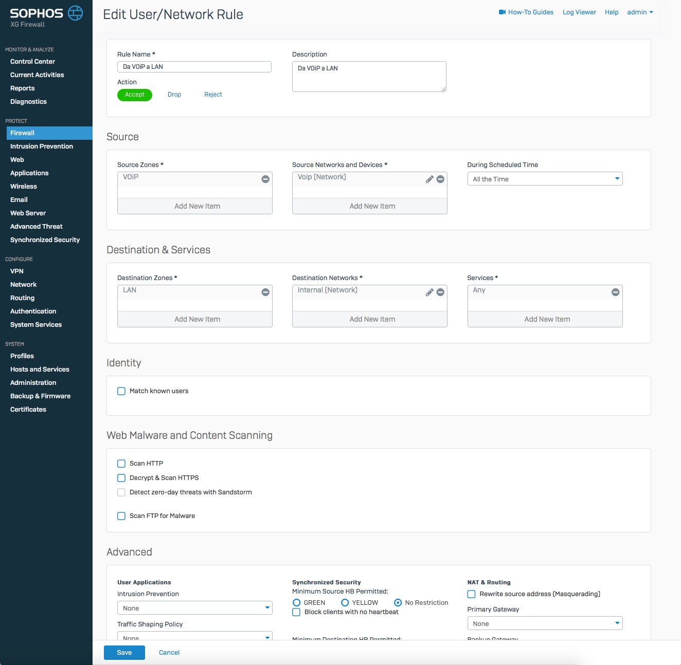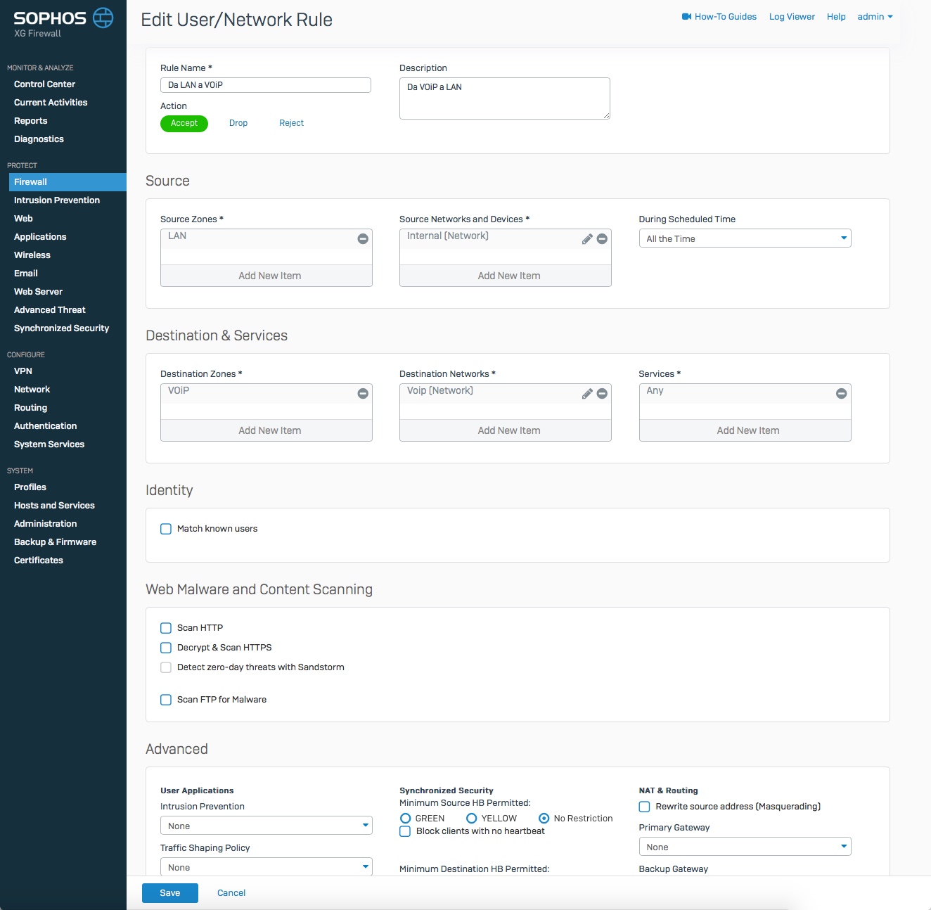 Now i want create a rule with specific services that connects the two networks, without the SIP packets of the voip network ending up in the LAN.