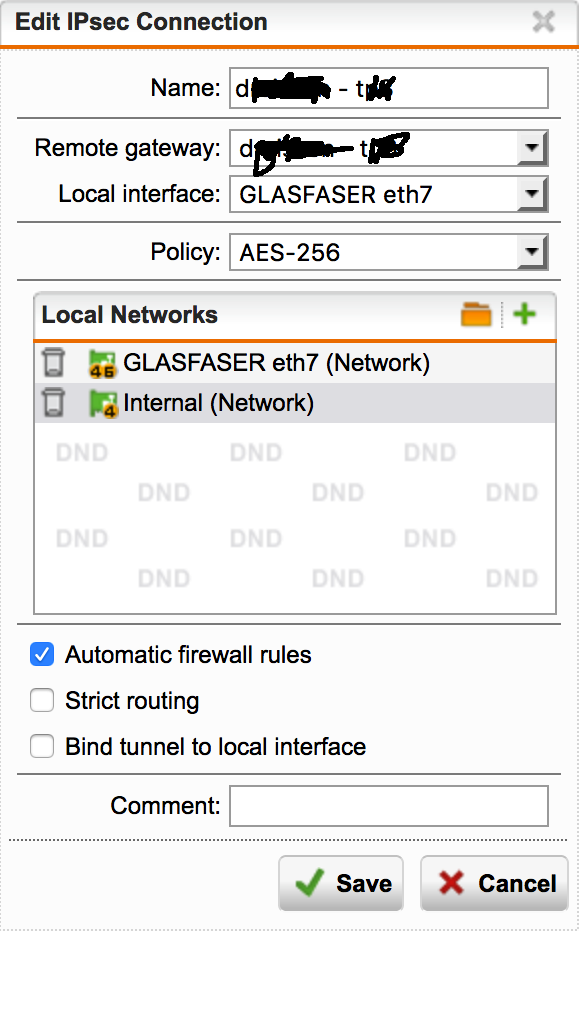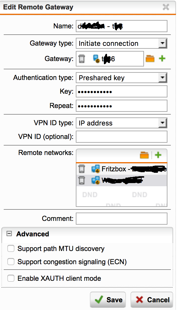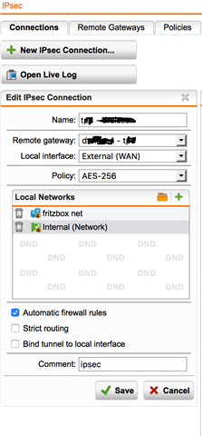 • Mir ist noch aufgefallen, dass bei IPSec - Advanced und VPN ID Ip address steht. Dort wird dann automatisch die dynamische IPv4 verwendet, dich ich vom ISP bei ausgehendem Verkehr zugewiesen bekomme. Setzte ich dort die interne IPv4 des Interfaces, kommt kein Verbindungsaufbau zustande. Die feste IPv6 nimmt er nicht an.