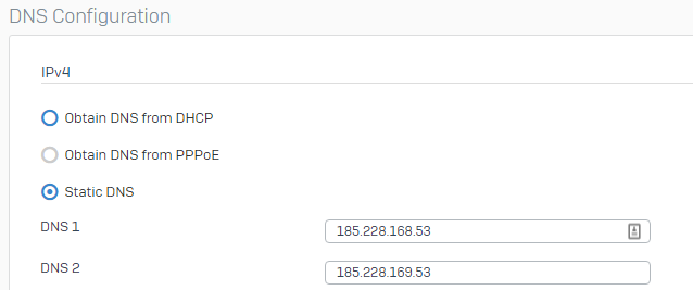 I'm using a DNS content filtering service (Clean Browsing) and am trying to specify different DNS servers for different zones so that different DNS filtering policies are applied by setting the DNS servers in each specific zone's DHCP settings and then allowing only those DNS servers through via a firewall rule. Clean Browsing allows you to create profiles with different DNS filter categories and generates new DNS server IPs for each specific profile. So clients pointing to Clean Browsing's DNS Server IP A from my WAN address get a different DNS filter policy than those pointed at DNS IP B