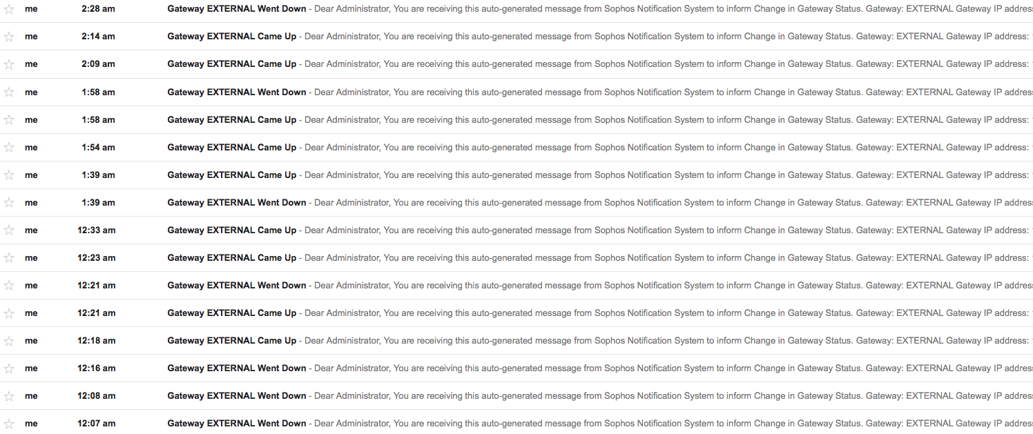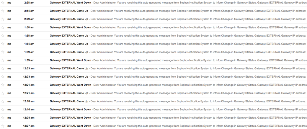 Are any of you guys/gals having your XG report your external WAN as down or up over and over again ? I have called my ISP to verify everything on their end during the times I got the notifications. They said everything is good and I even had a tech come out and physically check the connection coming in and he said everything was fine as well. (no packets lost either) I'm sure this is some kind of system glitch because when it says its down, I immediately check for internet access and everything is fine. Just this morning I woke up to a slew of emails stating the status was up and down. It happens almost everyday at random times of the day and more when I am not on site of course.