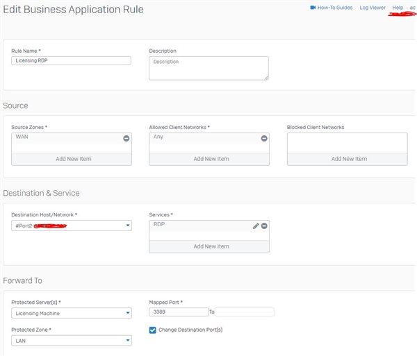If your Licensing Machine is listened on port 3389, then there's no need to check the box "Change Destination Port".