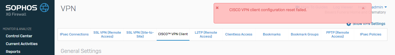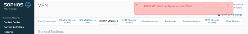 A long time ago I setup the Cisco VPN configuration because we had a vendor who had the Cisco VPN client and they used it to VPN into our network.  That vendor has moved on and I wanted to "reset" the config back to default.  When I hit Reset, after a couple of seconds I get a red bar at the top of the page which helpfully says, "CISCO VPN client configuration reset failed."  No other information about why it failed or what I could do to resolve the issue is presented or recorded that I can find.