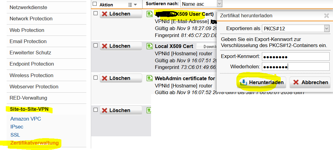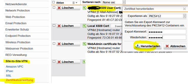 Scheint ein Problem mit dem Namen des Zertifikats zu sein. Man kann jedes Zertifikat exportieren, dass _keine_ Klammern in Namen hat, jedoch keines mit Klammern. Beim Anlegen eines neuen Users erstellt die UTM automatisch ein Zertifikat mit Klammern im Namen.