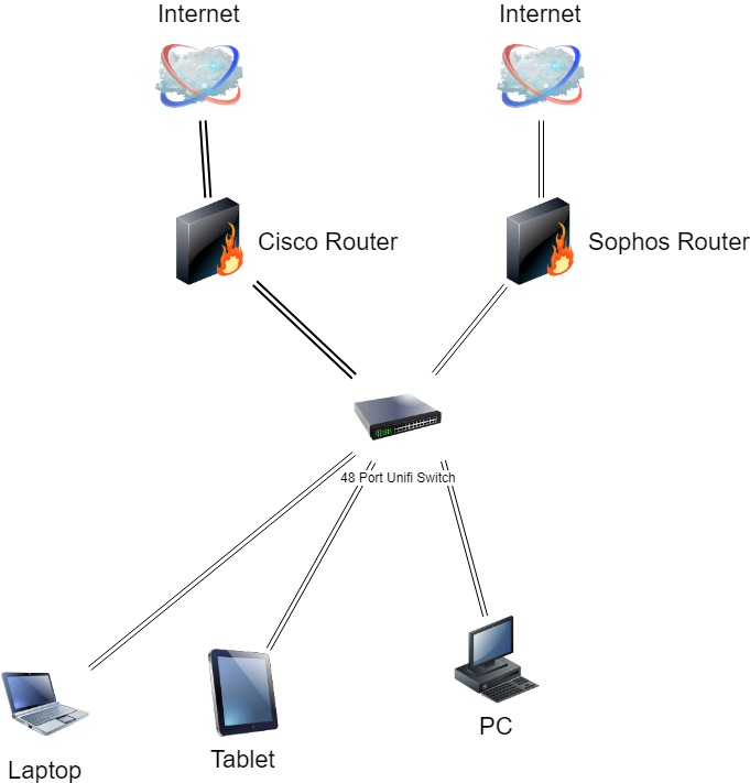 • This diagram is what I am trying to achieve. I need those computers to be able to talk to machines on the Cisco as well as the Sophos router. I want all their primary traffic to go out over the Sophos router.