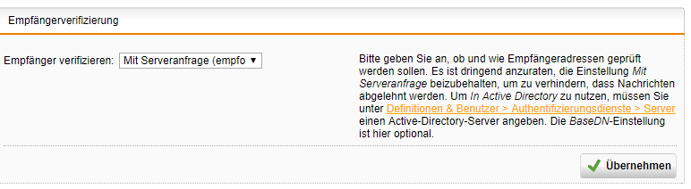 Wir haben die Empfängerverifizierung gegen unseren Exchange aktiv, sowohl über AD Verifizierung als auch über die empfohlene Verifizierung via Mailserver funktioniert dies aber scheinbar nicht korrekt, wenn die Mail zuvor schon in die Quarantäne ging.