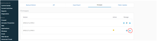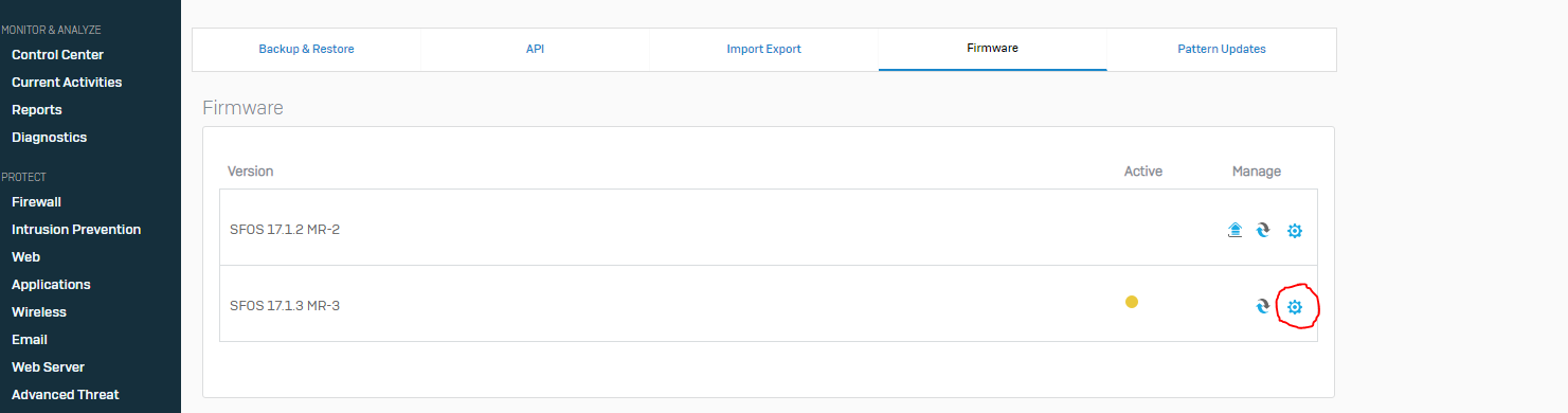 Le paramétrage du mode bridge se fait lors du premier boot du firewall Sophos. Le plus simple est donc de le réinitialiser avec les paramètres d'usine. Pour cela il faut aller dans les Firmwares, et cliquer sur l'icone de la version de firmware voulue, puis sélectionner l'icone comme sur la capture d'écran ci-jointe.