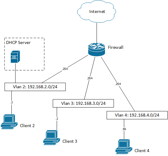 Alternativ: Auf dem DHCP Server in VLAN 2 ist ein Scope für VLAN 3 eingerichtet, zusätzlich ist auf der Firewall ein DHCP-Relay konfiguriert