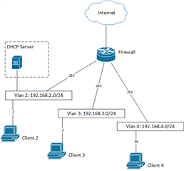 in VLAN 4 gibt es keinen DHCP Server, der Client4 hat die notwendigen Infos fest eingetragen: