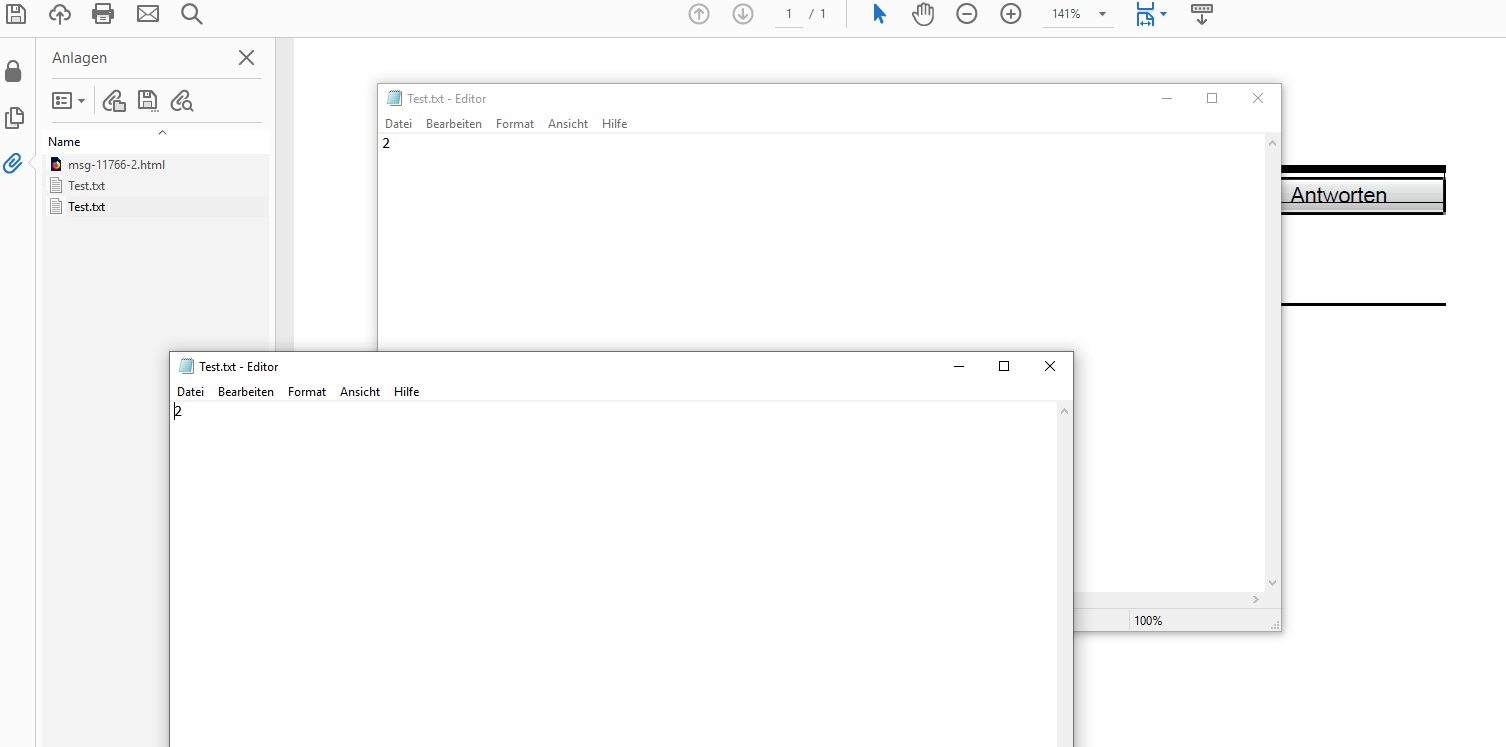 Ich hab die Mail mit zwei Dateien mit gleichem Namen verschickt, sobald ich die PDF im Adobe Reader aufmache wird mir immer der Inhalt der ersten Datei für beide Dateien angezeigt.