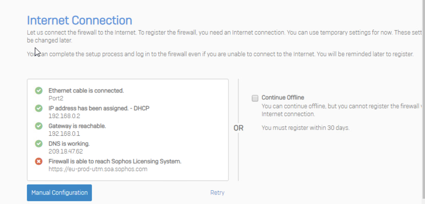 I have a brand new installation of XG 17.1.3_MR-3-250 for home use. It cannot contact https://eu-prod-utm.soa.sophos.com, but all the other tests pass (IP address is assigned to the WAN interface, gateway is reachable, DNS is working, etc.) If I choose to continue without registration, I CAN access the Internet through the XG, but I would like to get my appliance registered. For others, I have read that a re-installation fixed the issue, but I have tried that twice without luck. Any guidance would be appreciated!