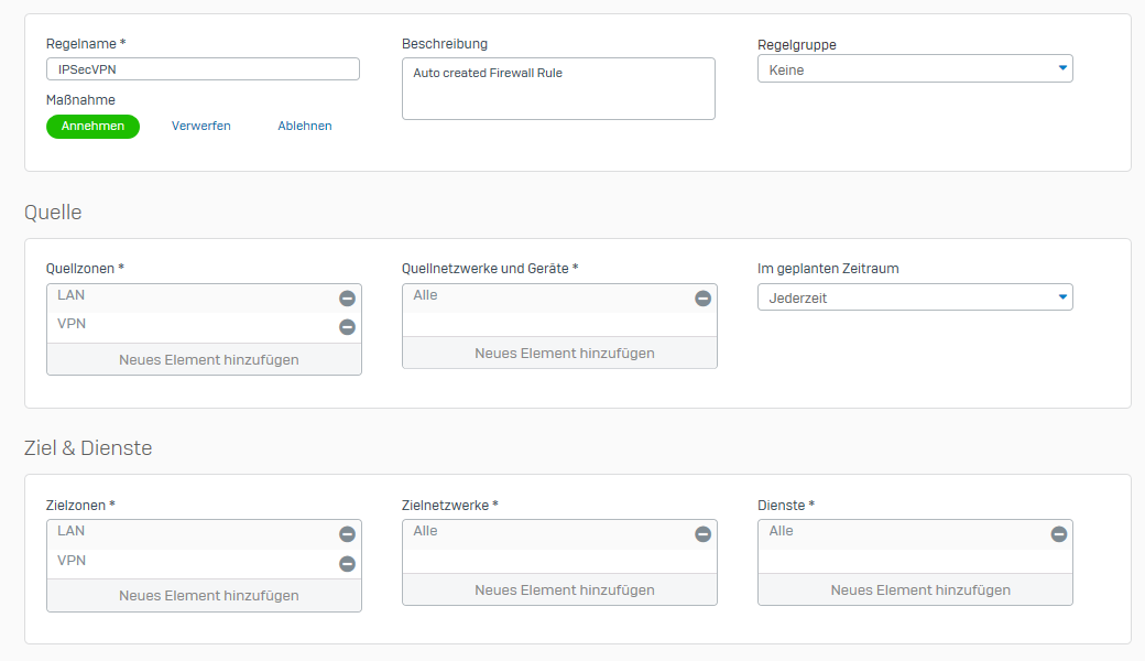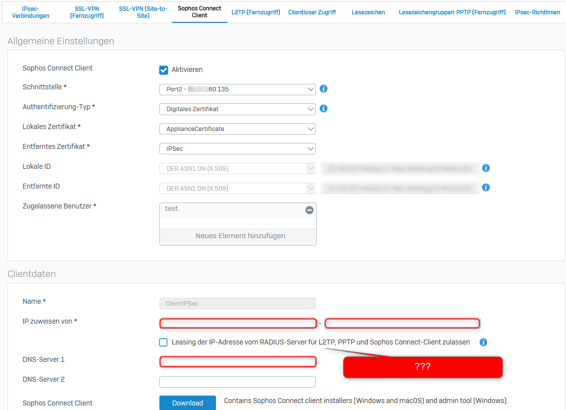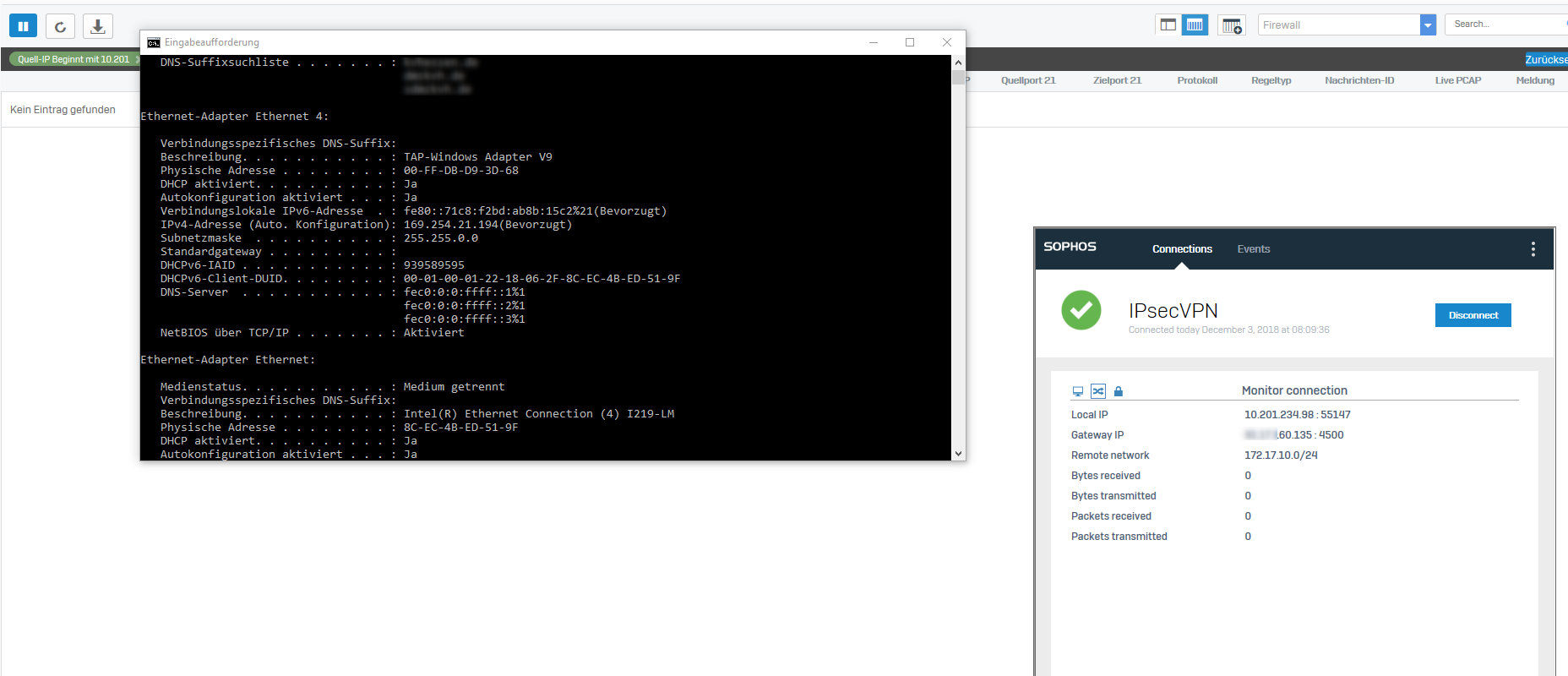 aktuell habe ich ein kleines Problem mit SFOS 17.5.0 und dem IPSec Conect Client. Ich kann mich erfolgreich mit dem Sophos Connect Client über IPSec mit der Appliance verbinden, komme aber leider nicht in das Interne LAN sowohl mit IP oder DNS.