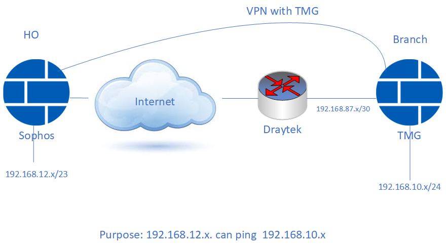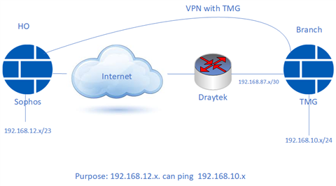I'm configuring VPN IPsec from Sophos XG to TMG (located behind Draytek) with topology like picture below. But seem TMG dosen't support that.
