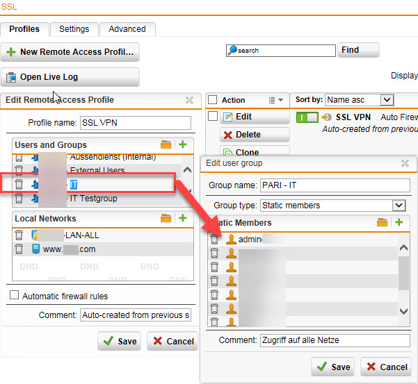 Versucht man das, läuft man immer in einen Timeout rein. Leider sehe ich sowohl im Remote SSL-VPN, als auch im Firewall Log nichts zu dieser Verbindung. Die Konfiguration des Remote SSL VPN ist nicht auf ein bestimmtes Interface limitiert (any) und läuft über TCP 443. Wir haben außerdem einen override hostname als IP gepflegt.