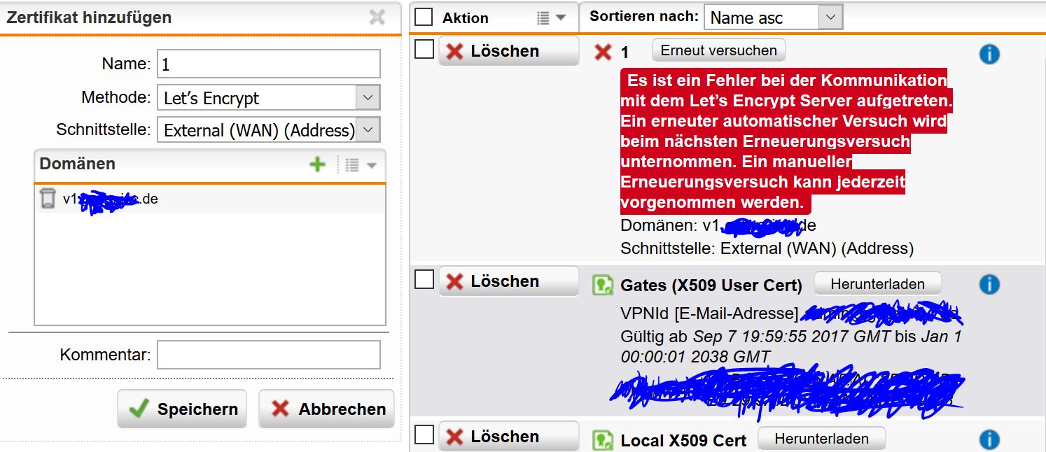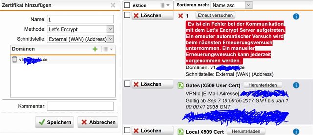 Ich erstelle mit der UTM ein Letsencrypt Zertifikat für den Domainnamen, es dauert ein Stück dann gibt die Sophos einen Fehler aus, das kein Zertifikat erstellt werden kann.