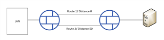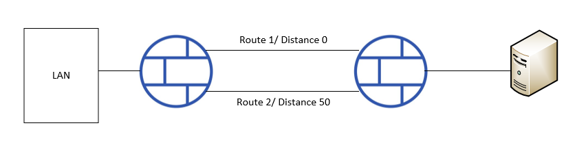 I'm facing a problem. I configured 2 static route to redundancy with different metric (like picture below). But when static route have low distance is unable to use (may be next hop is dead,...), the other static route (that have high distance) dosen't work, traffic still go through via route have low distance.