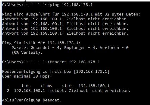 Ich komme allerdings aus meinem 192.168.100.x-Netz nicht mehr in das Netz der Fritzbox rein, d. h. ich kann die FB weder anpingen noch auf die Weboberfläche zugreifen.