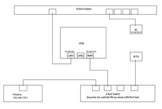 Fritzbox, sowie LAN und WAN Port der UTM sind nicht am selben Switch angeschlossen / bzw. es gibt keine Verbindung zwischen den Switchports der Fritzbox und dem Switch, der mit der LAN-Seite der UTM verbunden ist?