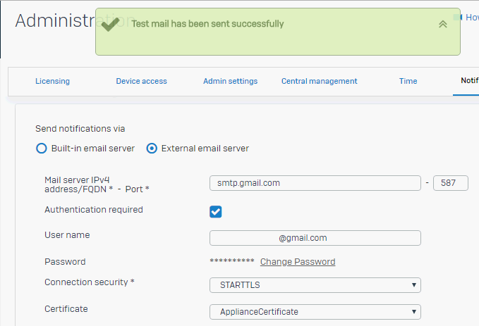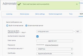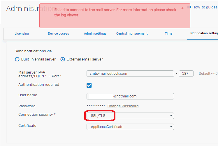 However, under System / Administration / Notification settings / Mail server settings, when I'm trying to use the same Outlook account (and credentials of course) for my Email Notifications SMTP settings in my Sophos XG, it ALWAYS fails to connect...!