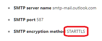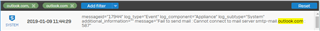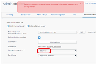 When looking at the logs, I find the following: messageid="17944" log_type="Event" log_component="Appliance" log_subtype="System" additional_information="" message="Fail to send mail : Cannot connect to mail server smtp-mail.outlook.com : 587"