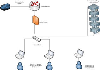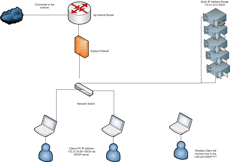 a) servers(172.21.24.5-30/24  GW is 172.21.24.1)+clients (172.21.24.50-150/24 via DHCP Server GW is 172.21.24.1)------------>switch(single VLAN)---------->Internal Interface (172.21.24.1) Sophos Firewall----connected via direct Ethernet cable to the internet router------->4g internet router-------> Internet