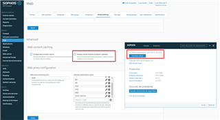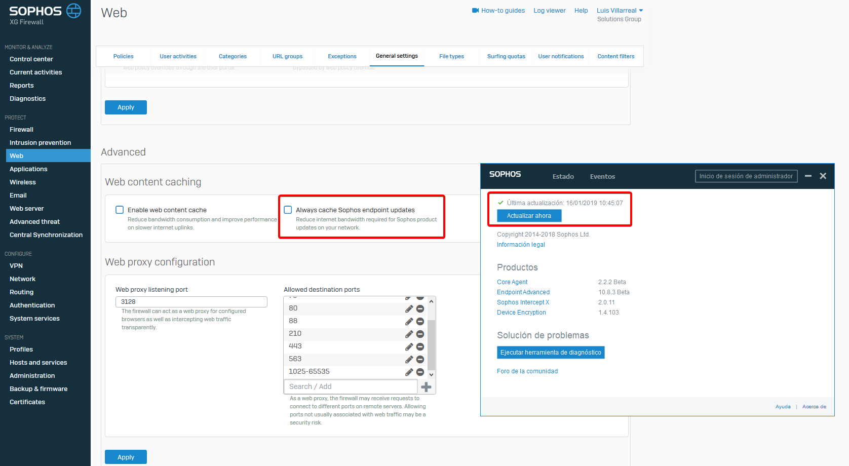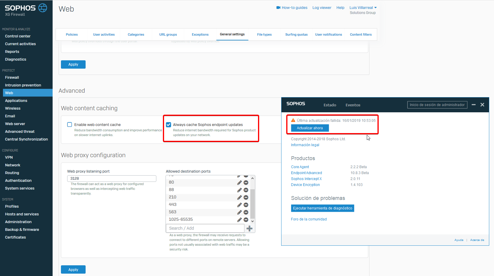 After an investigation with the Sophos agent (Update problem), and after several tests I see that the problem with the update fail resides in the XG Firewall. If the "Always cache Sophos endpoint updates" option is disabled in PROTECT/Web/General Settings, the agent is updated correctly. How can I clean/solve the problem in order to keep the option active in the XG.