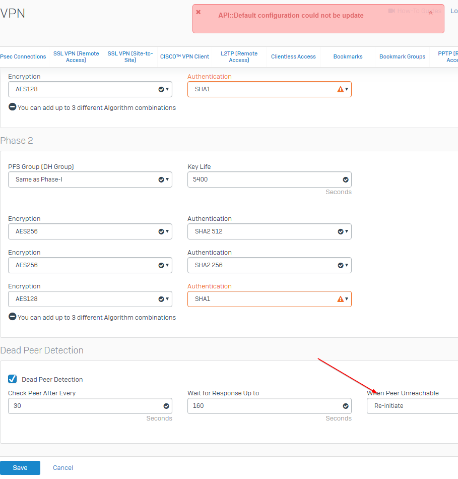 VPN policy profile save changes error Sophos API Default configuration could not be update