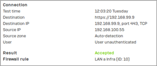 2019-01-22 11:58:22Firewallmessageid="01001" log_type="Firewall" log_component="Invalid Traffic" log_subtype="Denied" status="Deny" con_duration="0" fw_rule_id="0" policy_type="0" user="" user_group="" web_policy_id="0" ips_policy_id="0" appfilter_policy_id="0" app_name="" app_risk="0" app_technology="" app_category="" in_interface="" out_interface="" src_mac="" src_ip="192.168.100.55" src_country="" dst_ip="192.168.99.9" dst_country="" protocol="TCP" src_port="44438" dst_port="443" packets_sent="0" packets_received="0" bytes_sent="0" bytes_received="0" src_trans_ip="" src_trans_port="0" dst_trans_ip="" dst_trans_port="0" src_zone_type="" src_zone="" dst_zone_type="" dst_zone="" con_direction="" con_id="" virt_con_id="" hb_status="No Heartbeat" message="Invalid TCP state." appresolvedby="Signature" app_is_cloud="0"