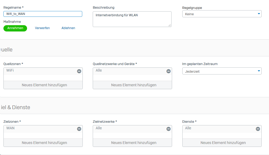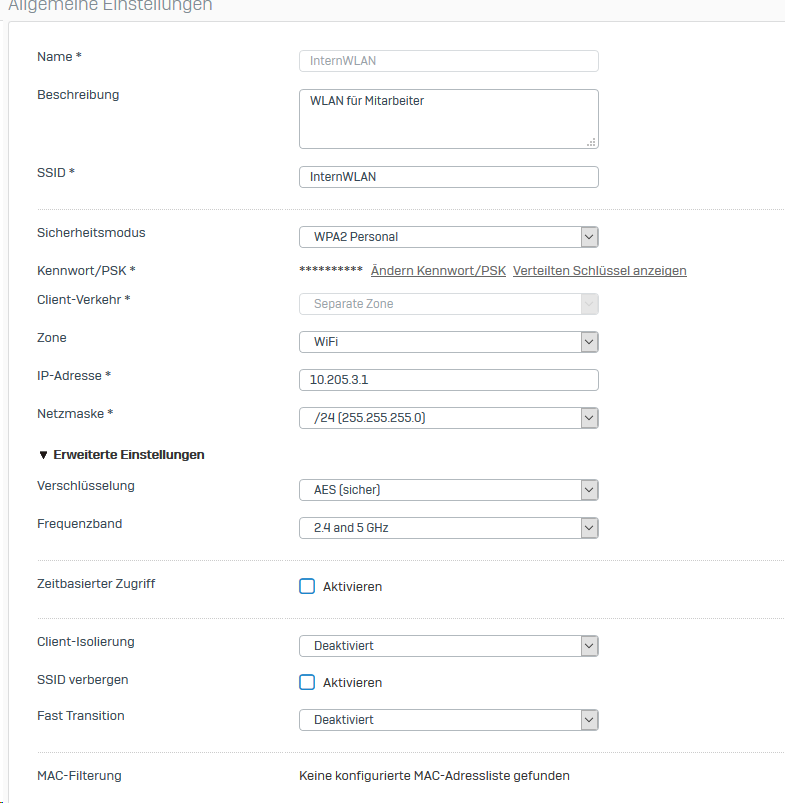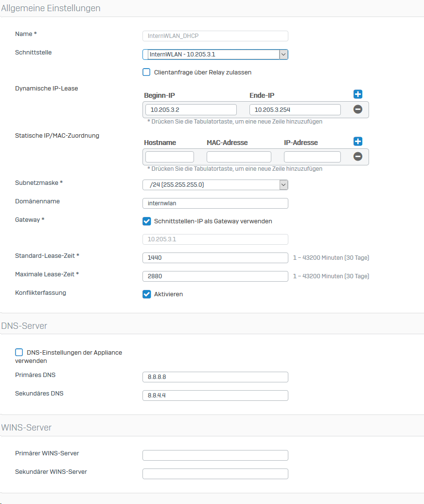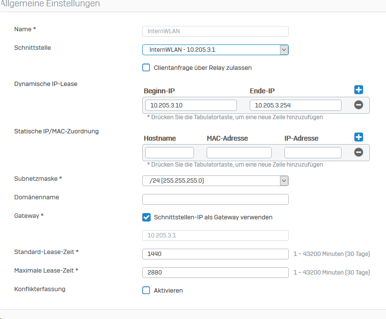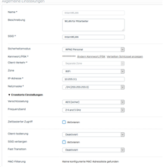 ich versuche gerade auf unserem Sophos XG Firewall eine separate WLAN für unsere Mitarbeiter zu erstellen, soweit habe ich alles mit der Anleitung von Sophos geschafft. Leider bekomme ich aber keine IP-Adresse von DHCP, die für diese WLAN konfiguriert ist. Habe sehr lange gesucht aber leider kein Lösung gefunden. Anbei paar Screenshots von der Einstellung: