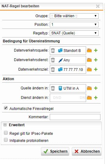 Jetzt soll auch von Standort B ebenfalls auf https://abc.xyz zugegriffen werden. Hier hätte ich dann theoretisch ein DNAT verwendet. Allerdings ist es nun auch so, dass die Box lediglich nur Anfragen aus dem gleichen Netzwerk erlaubt in dem es sich befindet. Und somit stehe ich vor dem Problem, dass ich sowohl SNAT als auch DNAT brauche. ein volles NAT habe ich bereits probiert, aber hier lässt er nicht zu die Konfiguration zu speichern, da bei Datenverkehrsziel ein ganzes Netzwerk (77.77.77.10/23) hinterlegt wird.