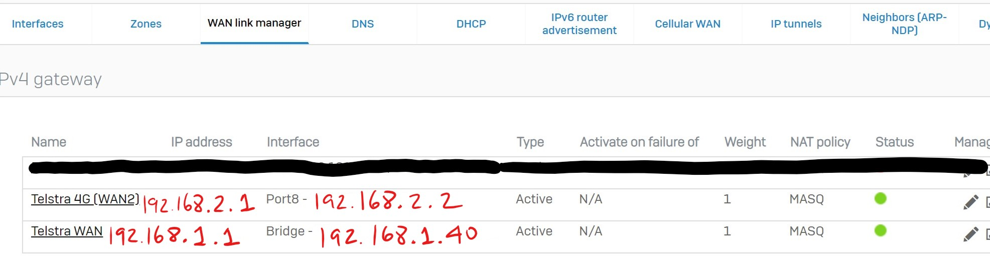 The reason why I think the problem is routing is because, a client computer will get an IP via DHCP that looks like: IP: 192.168.1.50 /24 and GW: 192.168.1.1. For some reason, even though the FW rule says the Primary Gateway should be Telstra 4G (WAN2) (PORT 8) it doesn’t.