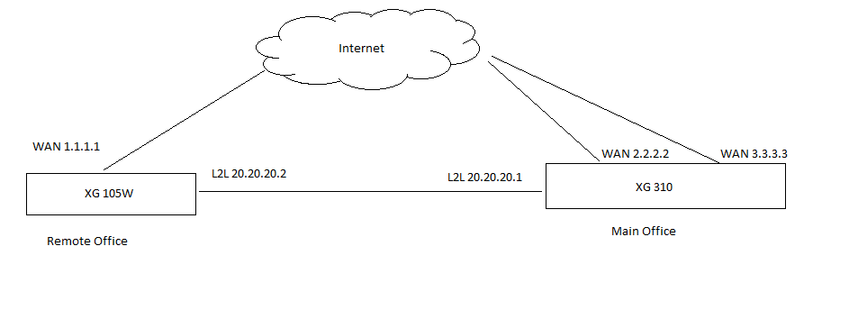 We thought it may be possible is to establish SSL VPN Site to site connections configuring each XG105 as the server, listening in the L2L and WAN interfaces, and configuring the XG310 as the client. The idea would be to set up 2 hosts in the client, first the 20.20.20.2 and then 1.1.1.1.