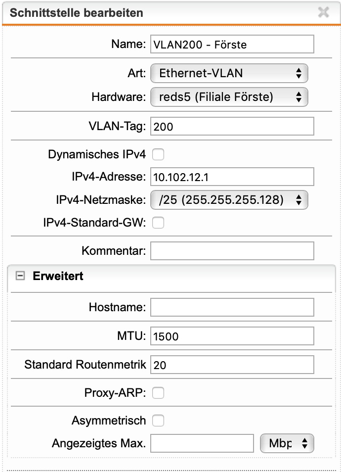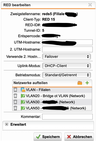 Die RED15 ist mit einem Interface als Typ Ethernet-VLAN (ID 20) und mit einem entsprechenden DHCP angelegt.