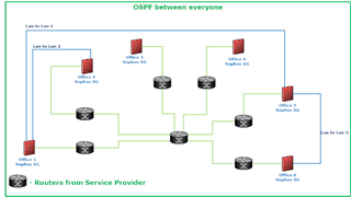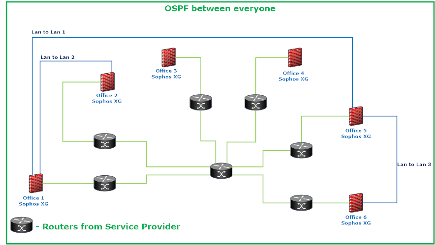 We received a rather unusual request from our client. So, they have Lan to Lan (similar to MPLS) links between their 6 offices (4 of them are located in the same city and 2 of them are located in 2 different cities) and they all have Sophos XG Firewalls. We configured OSPF in this Lan to Lan infrastructure so that all offices can reach one another. The reason why we chose to use OSPF over static routes is that they have two different kinds of Lan to Lan setups (I will post a network diagram of their infrastructure down below). One of them is a direct fiber cable between those 4 offices in the same city. The other one connects all 6 offices, but they go through a bunch of other routers from their service provider.