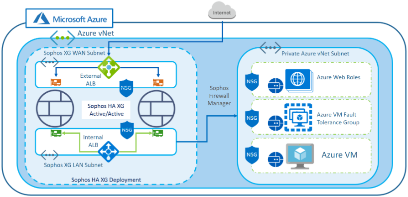 This article describes how to implement a full Active/Active HA Sophos XG on Azure. The deployment makes use of the new Azure standard load balancer with its HA ports feature for outbound load distribution.