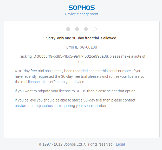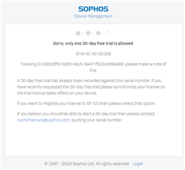 Can't activate license for home xg firewall. Initial activation led to unreachable screen, so had to select trial for 30 days