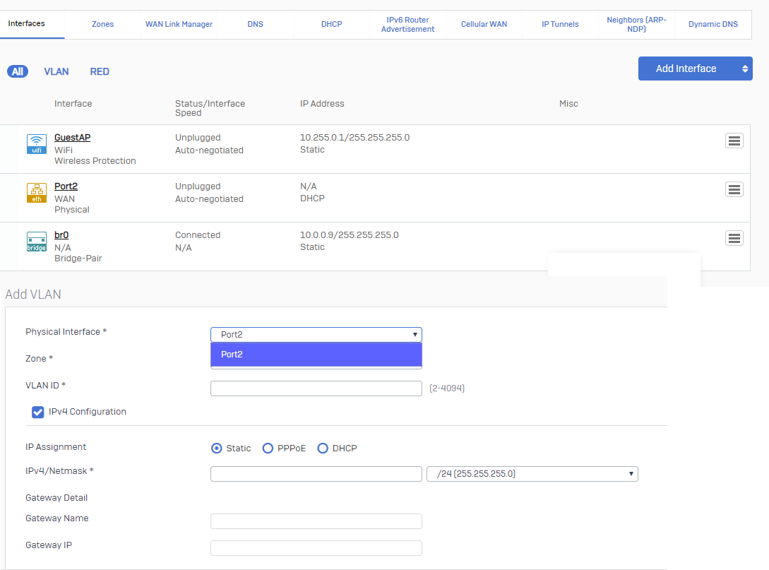 - It only allows me to add a VLAN on Physical Interface: Port2 and it doesn't allow me to choose VLAN ID 1. It also doesn't allow me to choose a gateway for it.