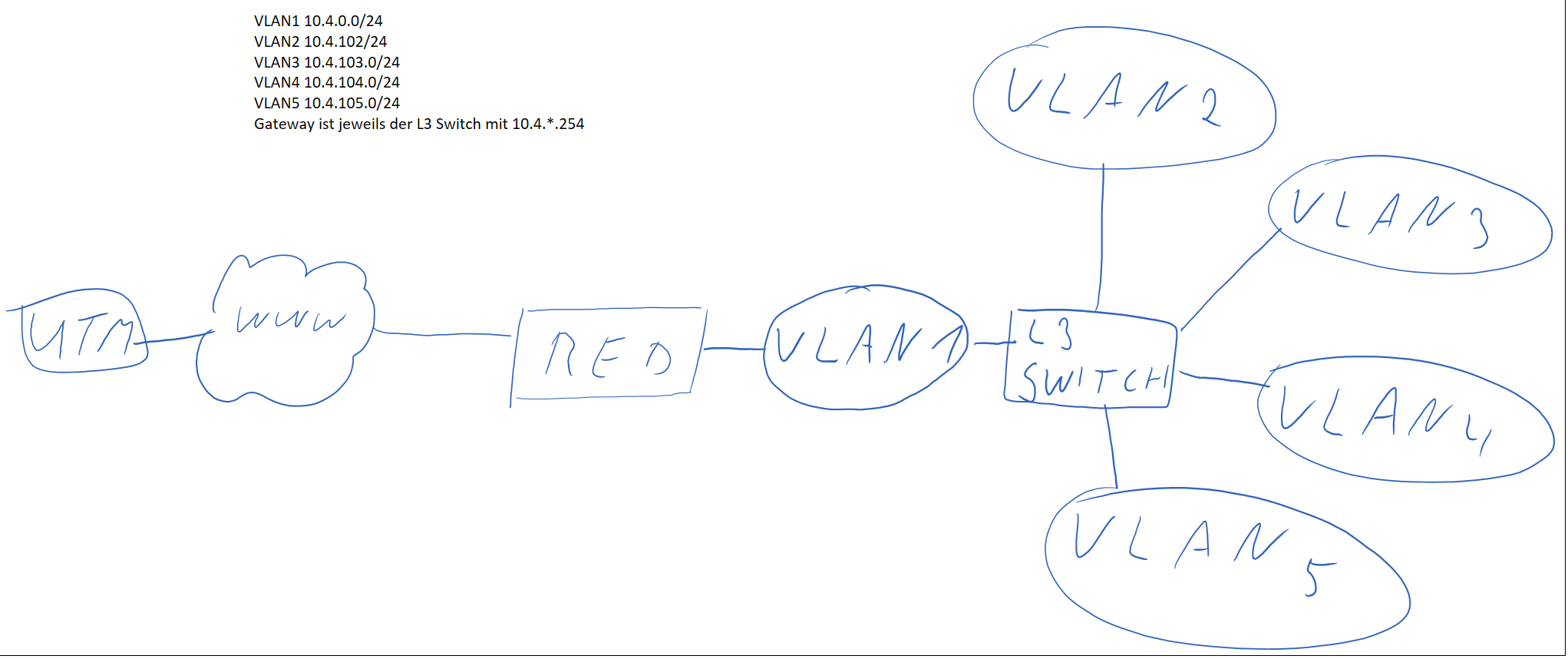 Es funktioniert alles, bis auf den Internetzugang der VLANs welches sich aus Sicht der RED hinter dem L3 Switch befinden.