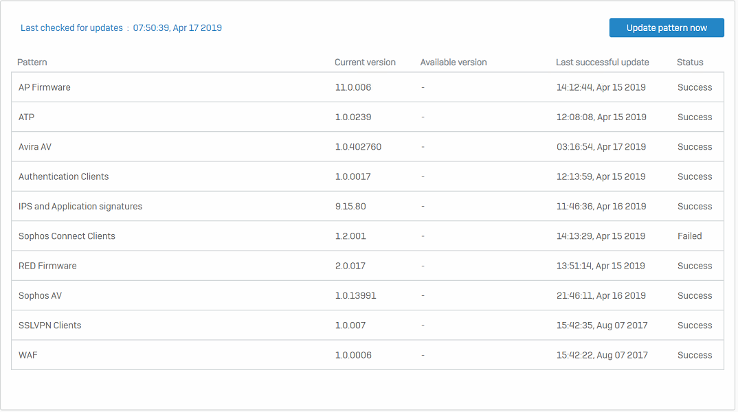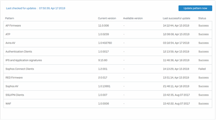 Sophos Connect Clients shows failed status on XG105 appliance on "pattern Updates" menu.