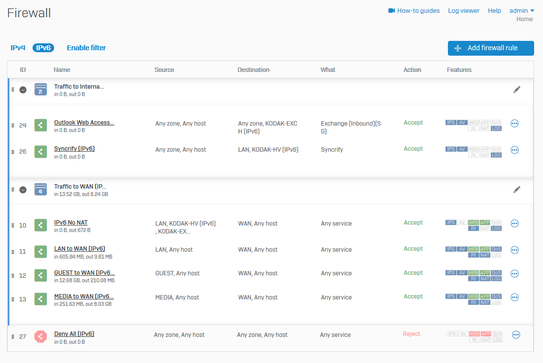 I'm trying to host a few servers on IPv6 behind my Sophos XG. I have a DHCP assigned /59 and have the internal network using one the provided /64 ranges. My attempt to access the servers via their IPv6 addresses fail, and I'm not even seeing the traffic hit the firewall rule. I was hosting them behind my UTM without issue, so I'm not sure what I'm doing wrong.