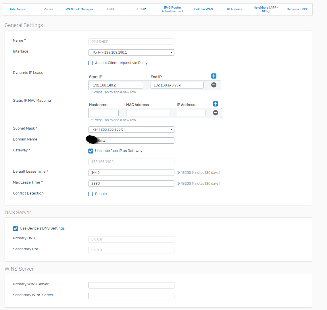 The XG Firewall is running DHCP for the DMZ, using itself as the Gateway and DNS.