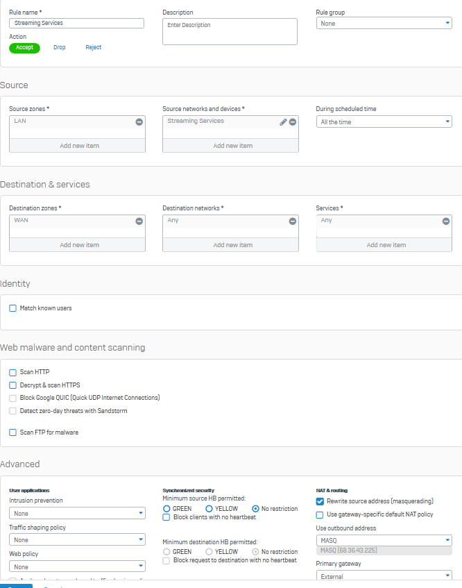 • On the source section of your firewall rule, how is “Streaming Services” setup? Is it IP or MAC address based? I would double check that to make sure it’s associating your Xbox One with that firewall rule.